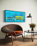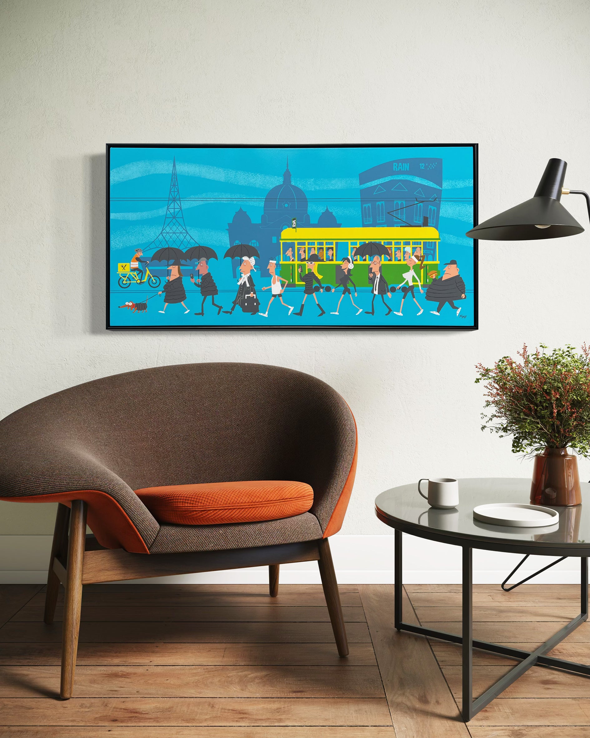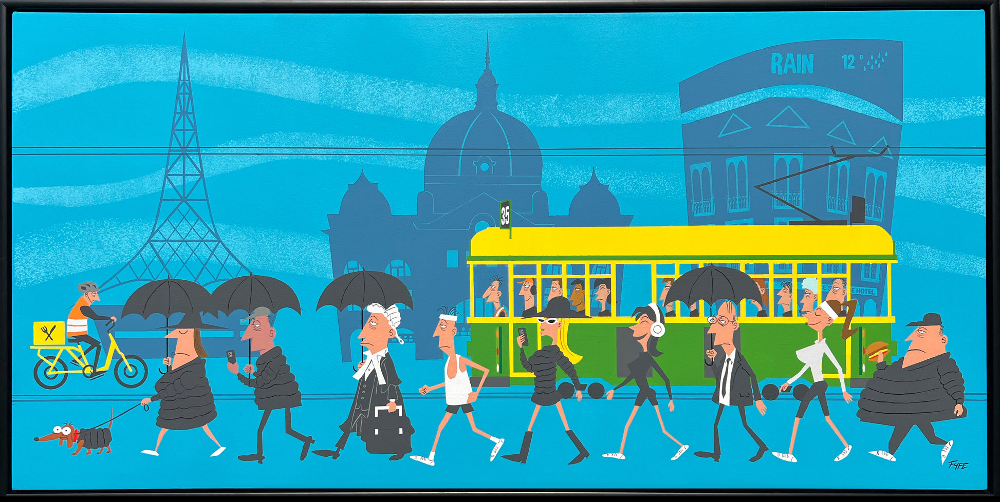 Winter, part of Fyfe’s Melbourne Seasons series, captures the city wrapped in puffers and umbrellas beneath a moody Melbourne sky. It’s the season of brisk walks and cosy layers, brought to life with iconic city charm. This is an original acrylic on Poly Cotton Canvas.