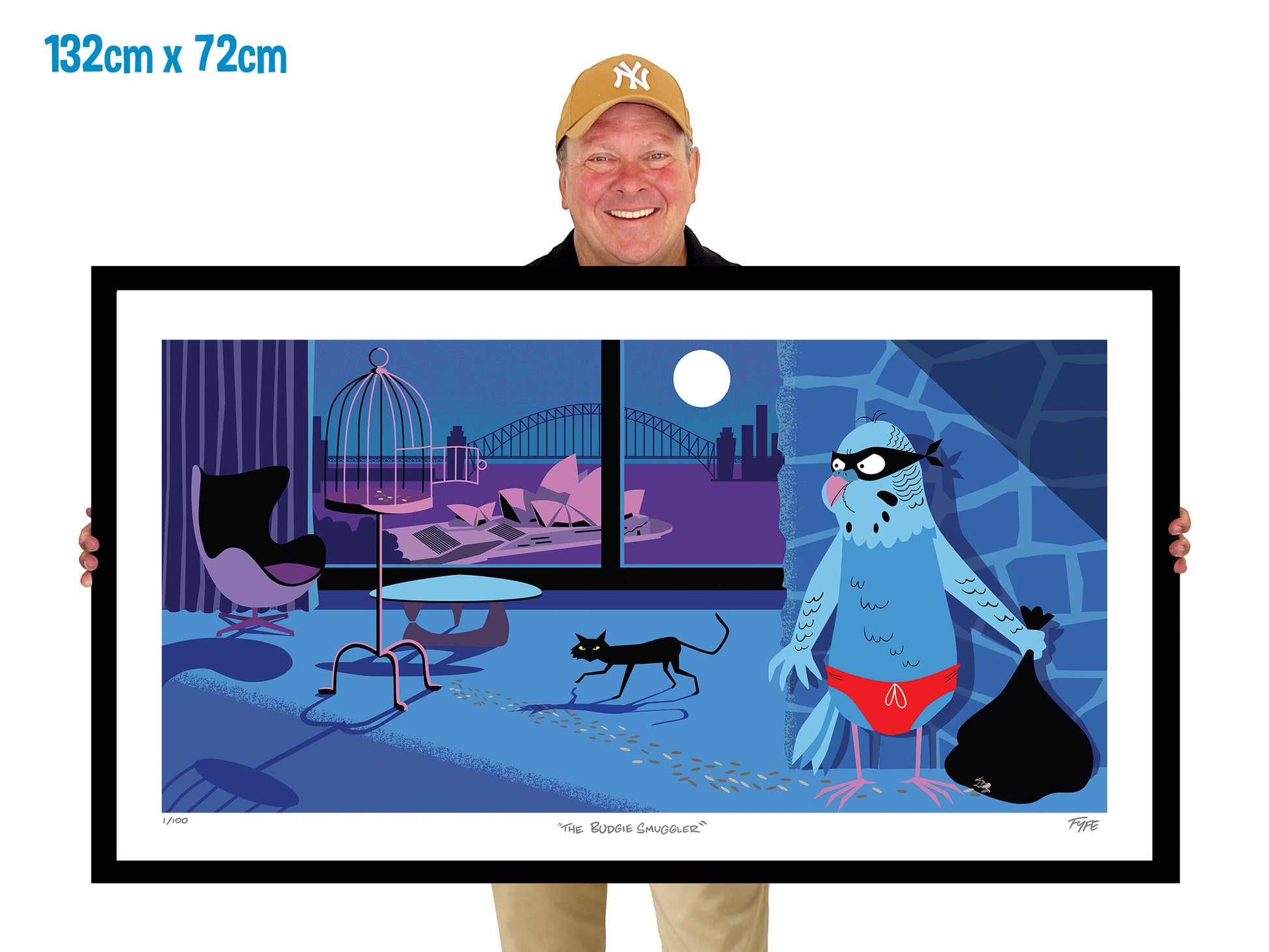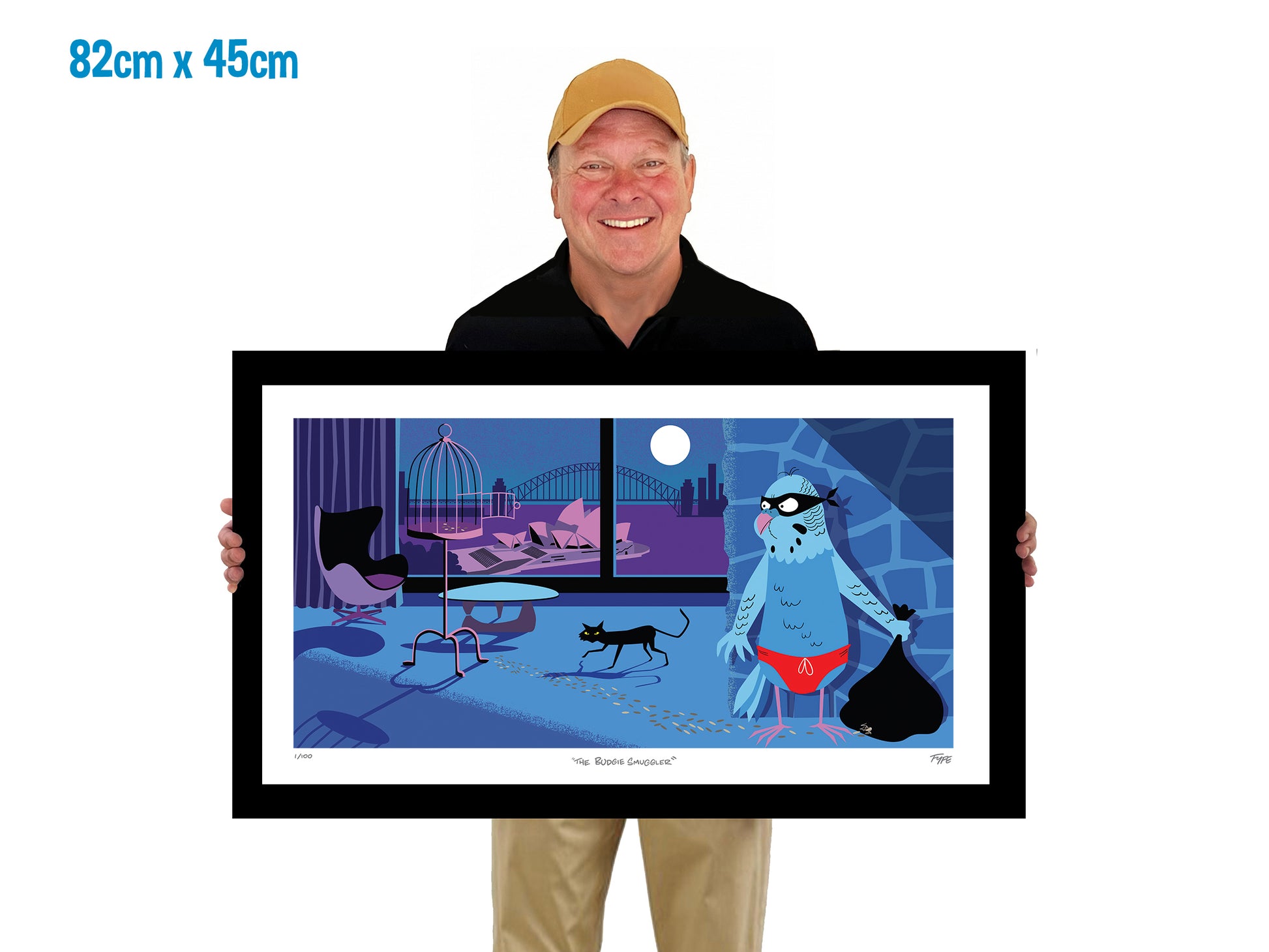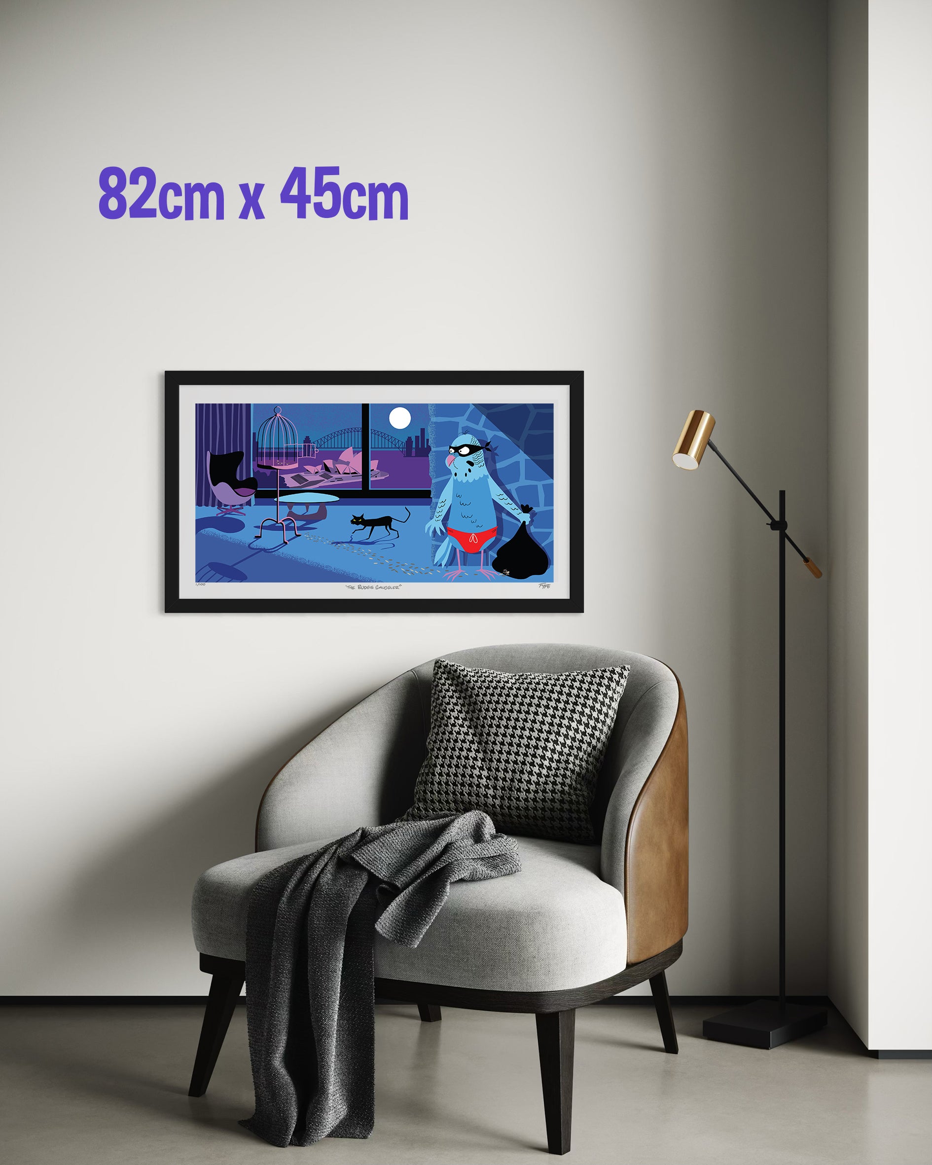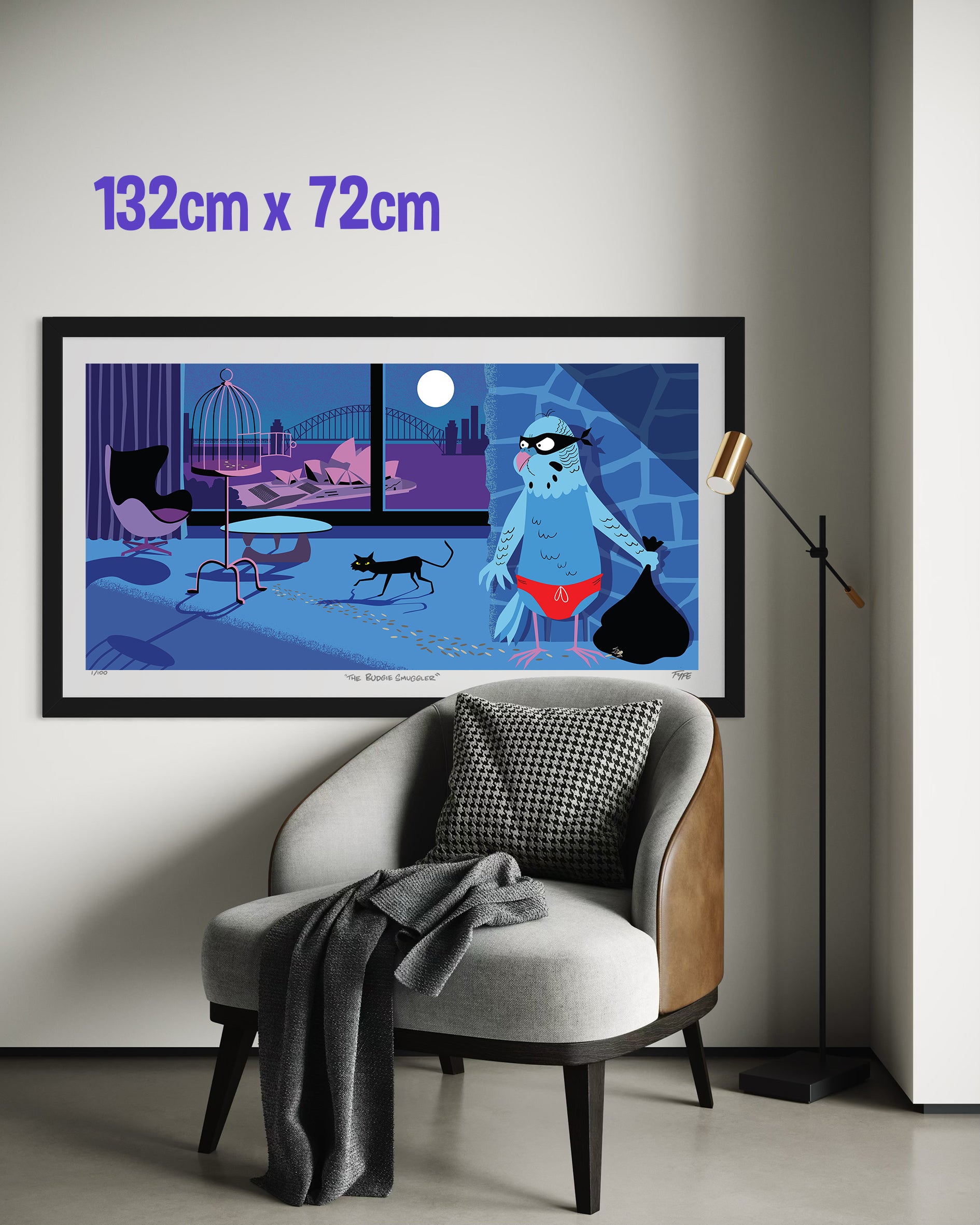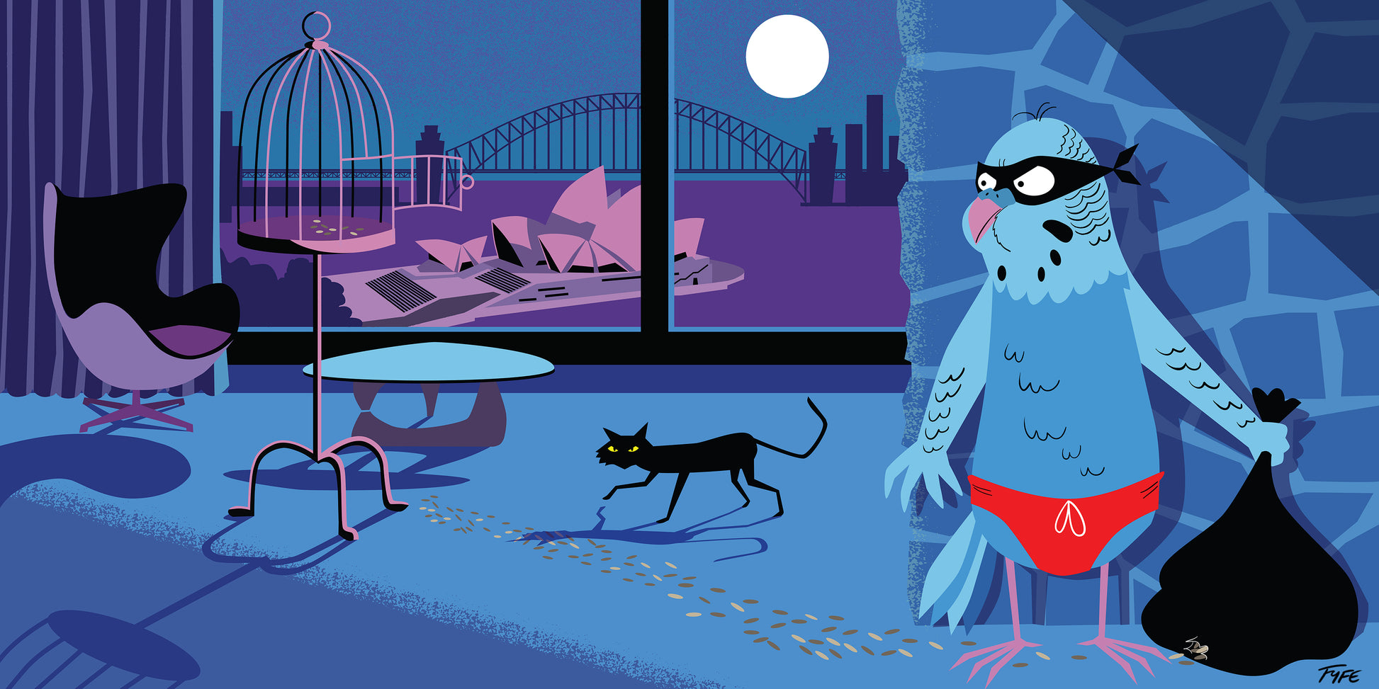 The Budgie Smuggler is a tongue-in-cheek snapshot of a budgie gone rogue, making a daring escape from an apartment overlooking Sydney Harbour — while a cat keeps watch just metres away.