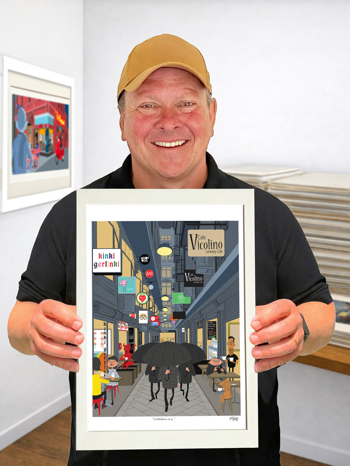 Umbrellas is a playful slice of Melbourne laneway life — umbrellas up, coffees in hand, and a wink to Hell’s Kitchen, where even the devil seems to blend right in.